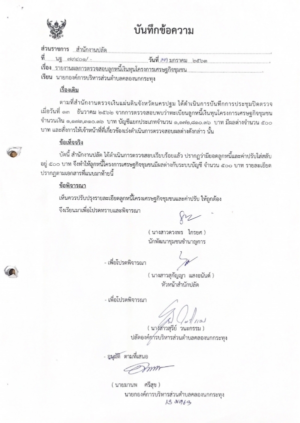 ข้อมูลรายงานผลการตรวจสอบลูกหนี้เงินทุนโครงการเศรษฐกิจชุมชน